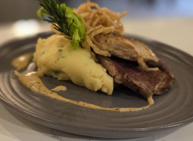Our local supplier, McAtamney’s, high quality local reared ribeye steak and chicken served with Bradmounts locally sourced potatoes & vegetables.