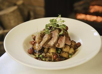 Seared Breast of Grange Farm Duck (recommended pink), parmentier potato, mushroom, shallots and peas with cranberry pan gravy.