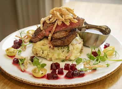 McAtamney’s Ribeye Steak, aged 40 days, served on maple cure bacon colcanno, napped with a McIvor’s plum cider reduction, honey roasted beetroot to garnish and crowned with crisp tobacco onions